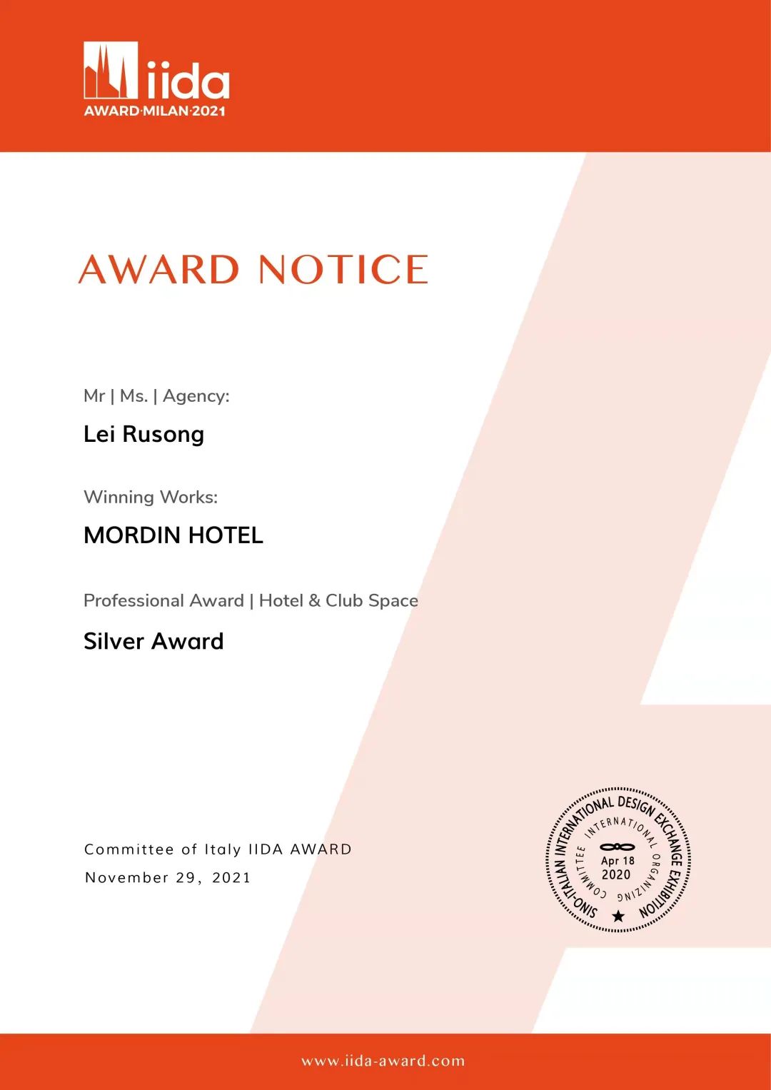 2021年12月,有幸参加第二届 意大利“IIDA AWARD”国际设计大奖公布获奖结果。我公司拍摄客户-瀚雷设计【广州中新知识城MORDIN酒店】荣获酒店会所空间设计类-银奖!